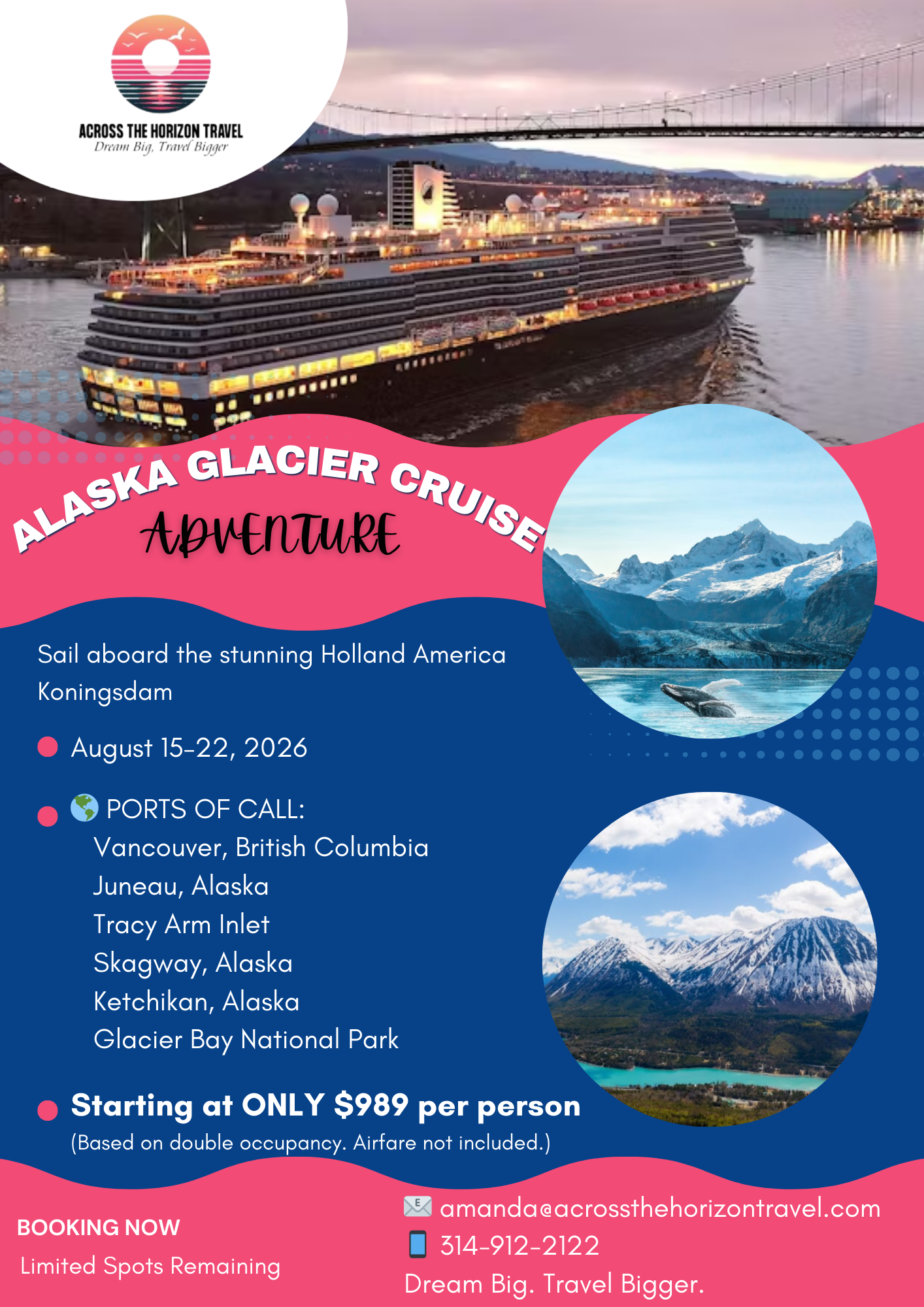 Hosted by Amanda Hietter, our CEO, you’ll receive guided support before and during the trip, plus access to onboard destination experts and a private nature guide experience exclusively for our group. Every detail is handled through Across the Horizon Travel so you can relax, connect, and fully take in the beauty of Alaska.