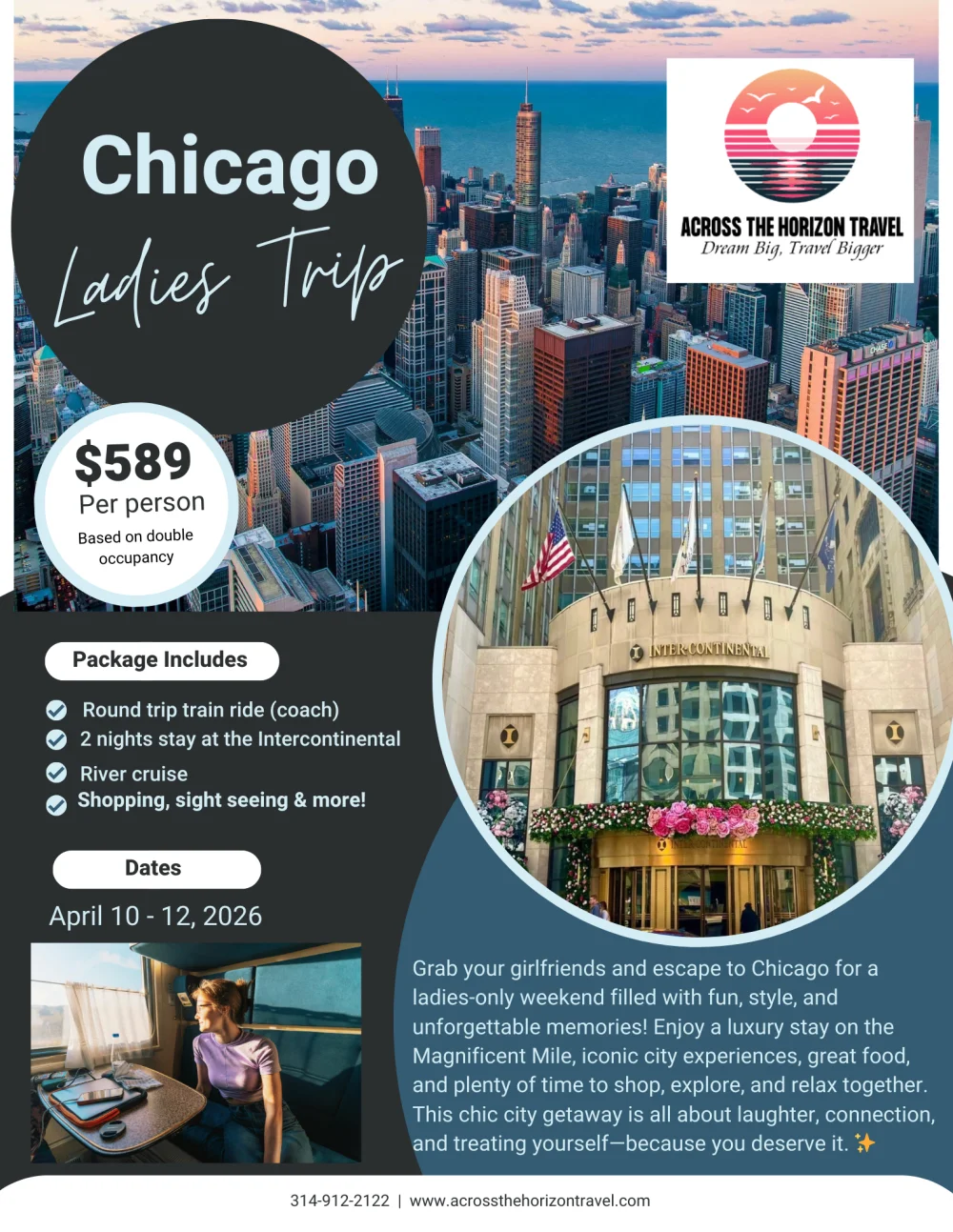 Join us for a ladies-only weekend getaway to Chicago, April 10–12, 2026. This curated group trip includes round-trip Amtrak transportation from St. Louis, a 2-night stay at the InterContinental on the Magnificent Mile, and a Chicago Architecture River Cruise. Enjoy a perfect balance of planned experiences and free time to shop, explore, relax, and connect.