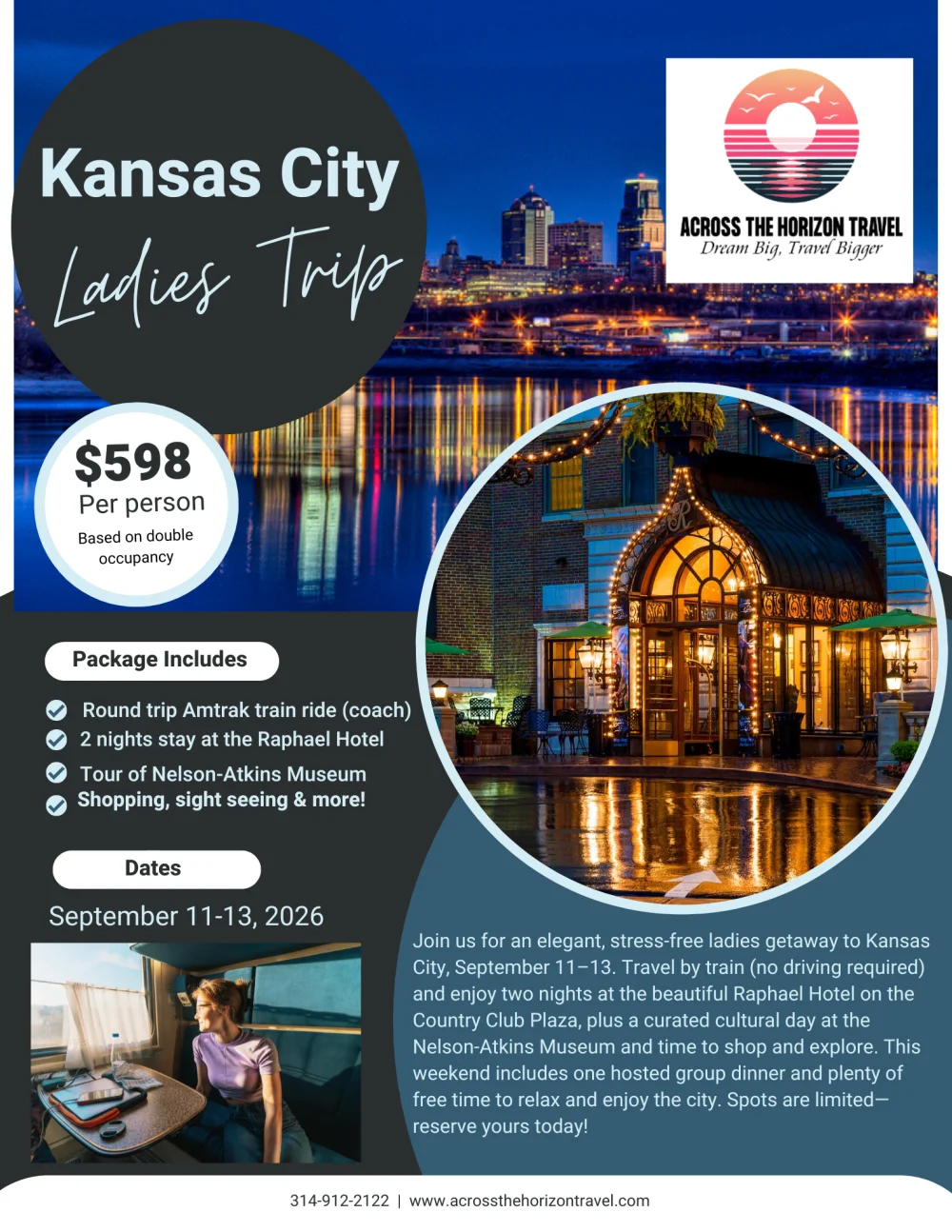 Join us for an elegant, stress-free ladies getaway to Kansas City, September 11–13. Travel by train (no driving required) and enjoy two nights at the beautiful Raphael Hotel on the Country Club Plaza, plus a curated cultural day at the Nelson-Atkins Museum and time to shop and explore. This weekend includes one hosted group dinner and plenty of free time to relax and enjoy the city. Spots are limited—reserve yours today!